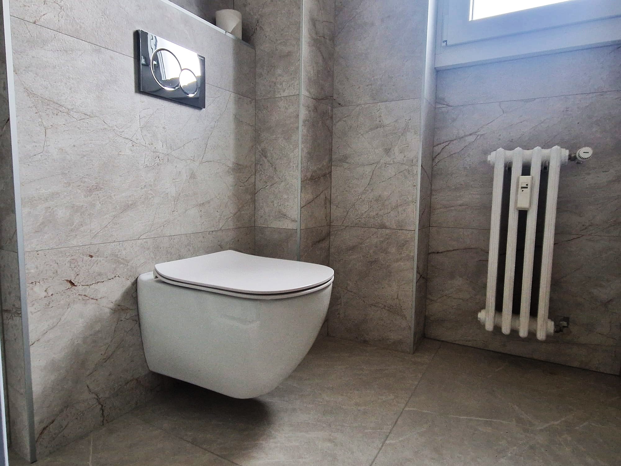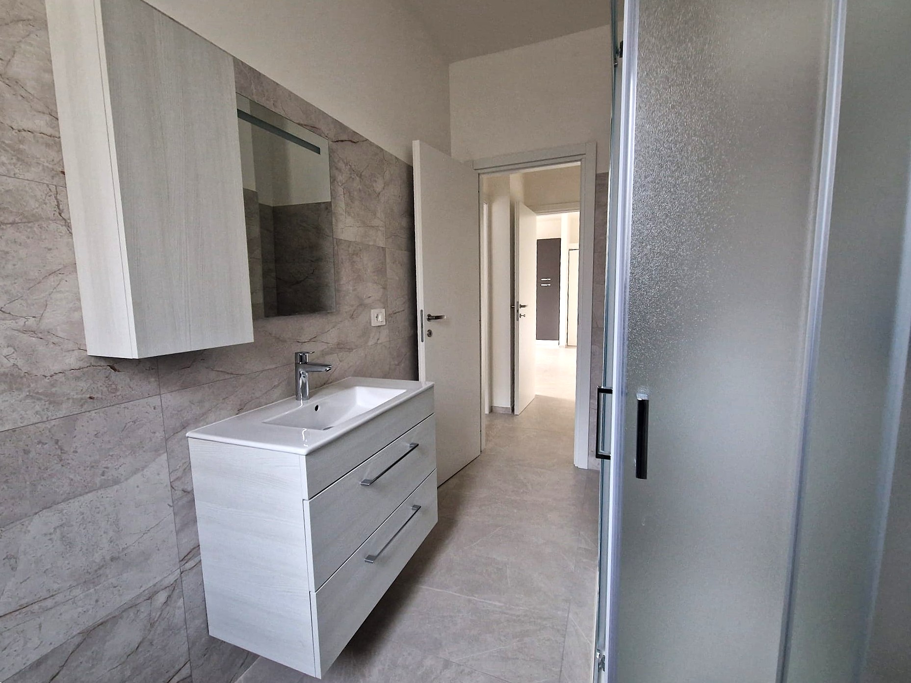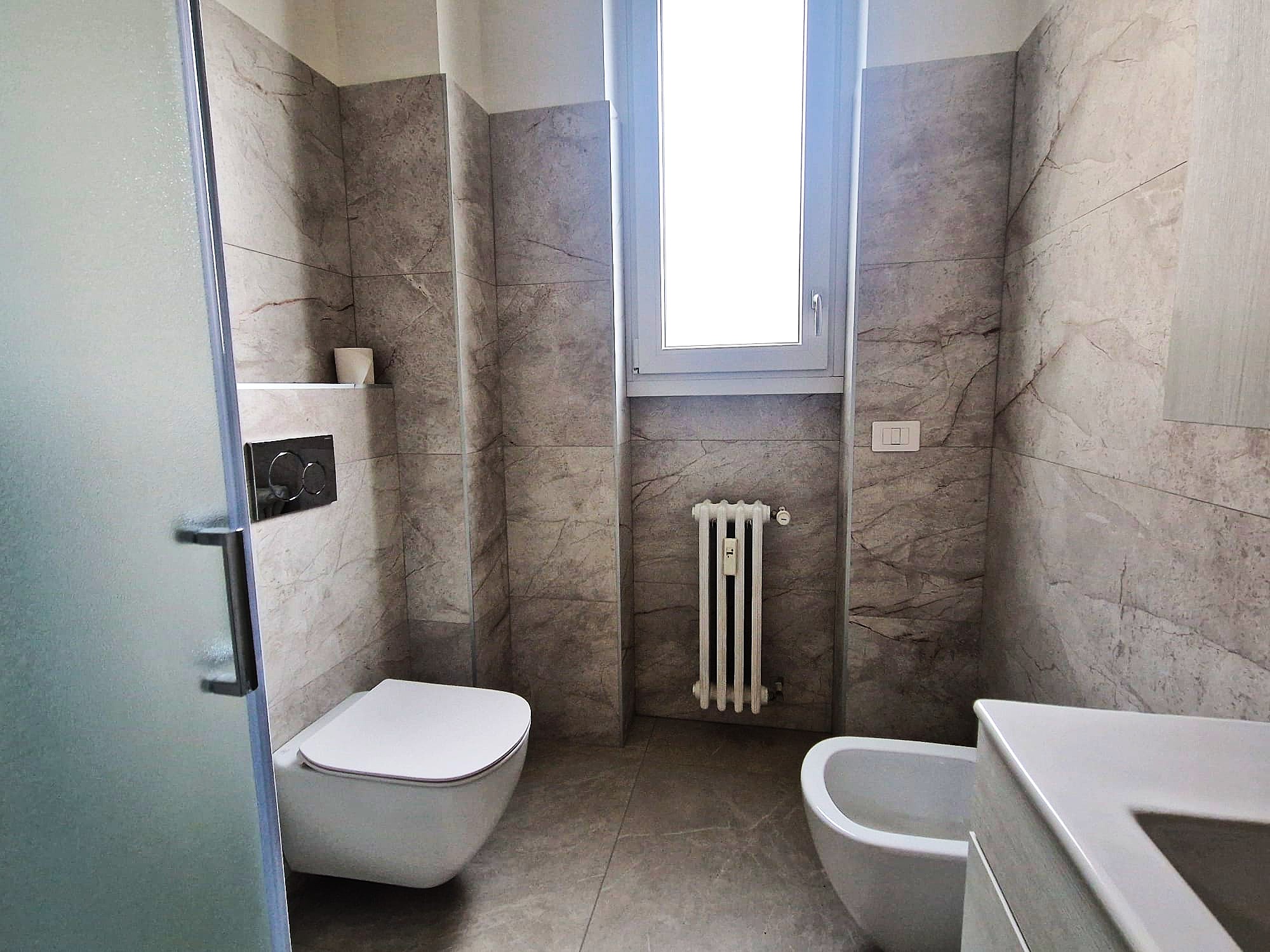 Zona Servizi: Bagno moderno completo di box doccia e pratico ripostiglio organizzato come soluzione salvaspazio.